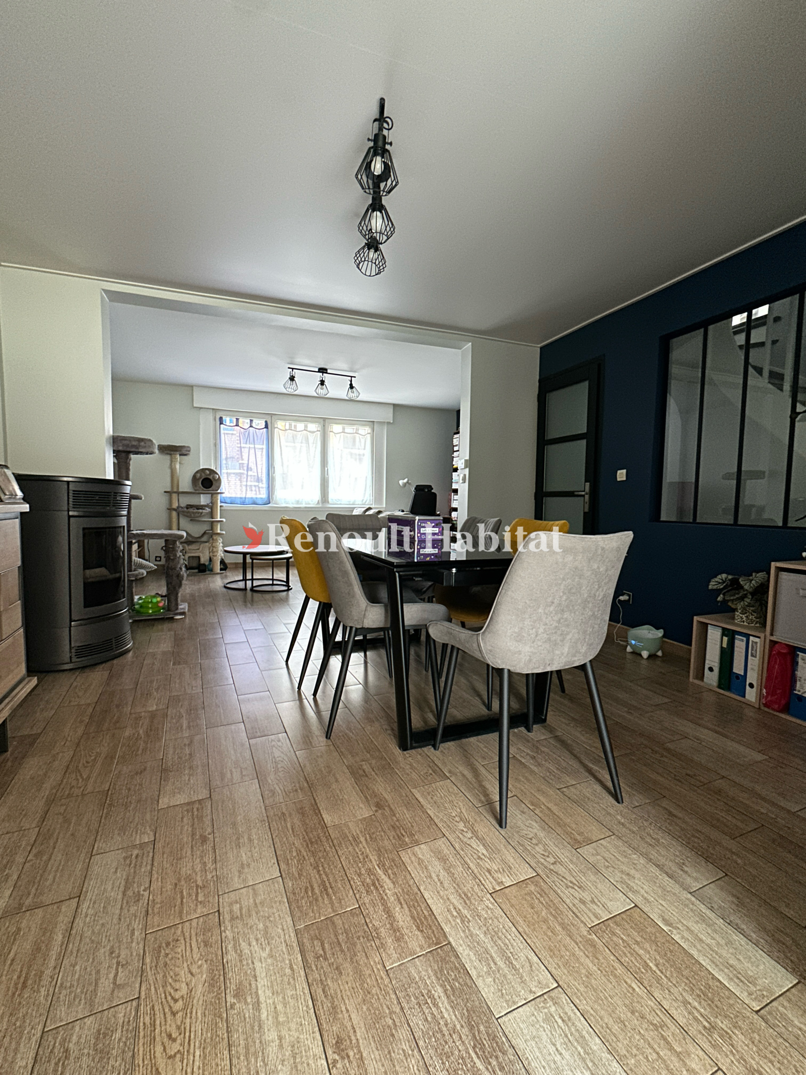 Découvrez cette maison individuelle comprenant au rez-de-chaussée : entrée, séjour avec cheminée à pellets, cuisine équipée, bureau et buanderie.