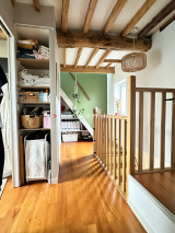 Pièce de vie chaleureuse avec poutres apparentes et CFDBI, cuisine équipée ouverte.